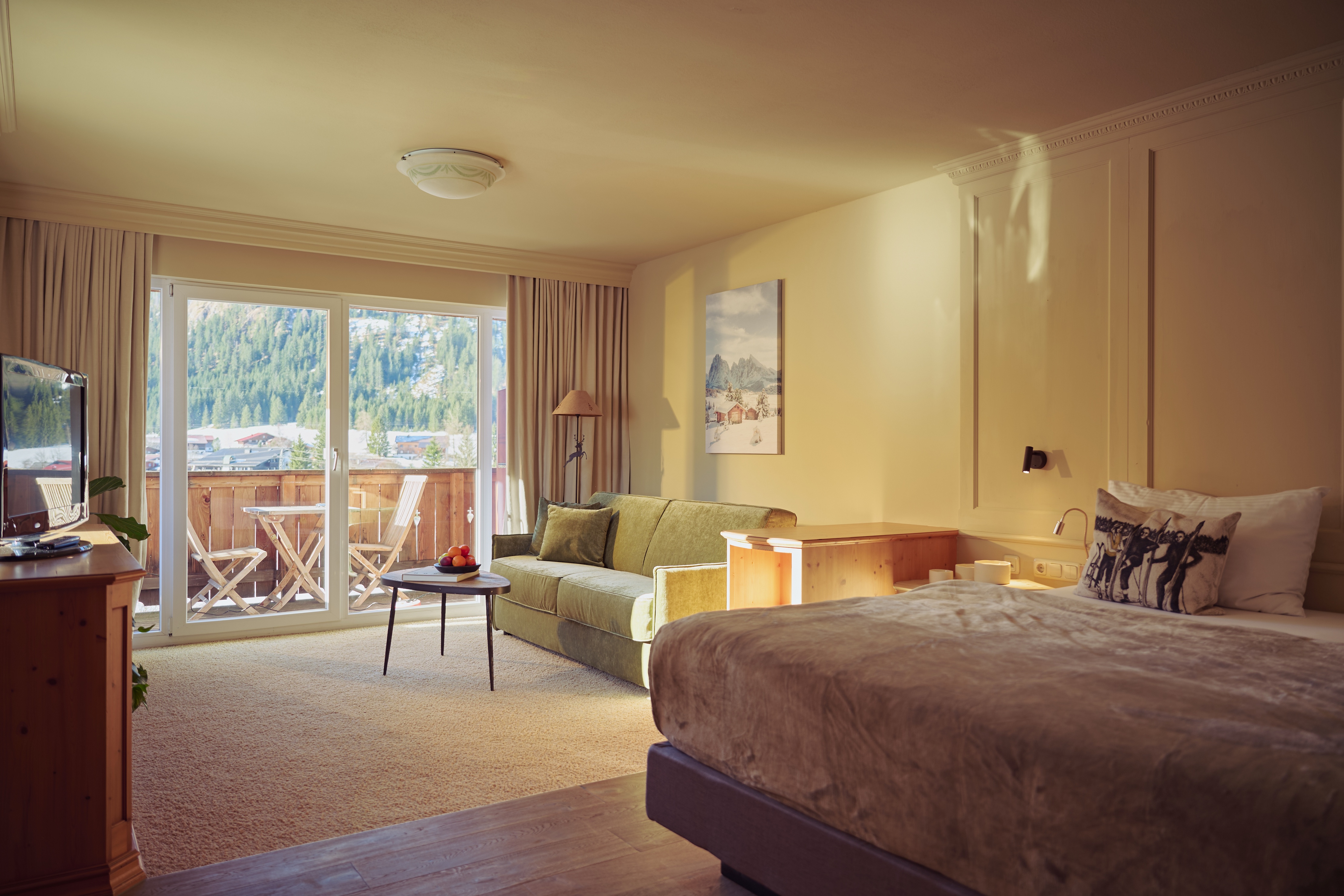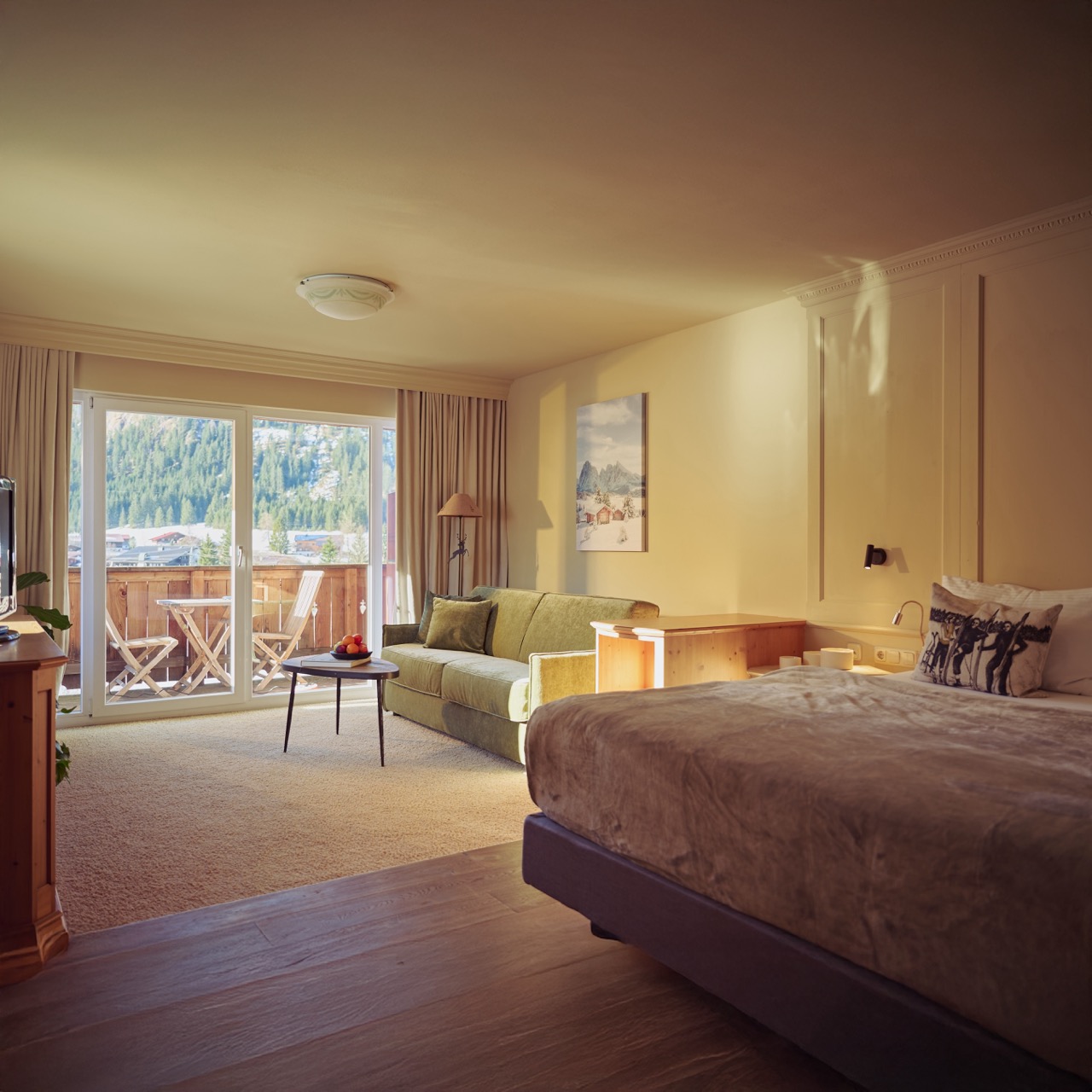 Großzügige Zimmer mit Balkon und Blick auf die Berge des Tannheimer Tals schaffen Raum für Ruhe und Rückzug. Viel Platz, klare Gestaltung und komfortable Boxspringbetten sorgen dafür, dass man nach einem Tag draußen schnell zur Ruhe findet.